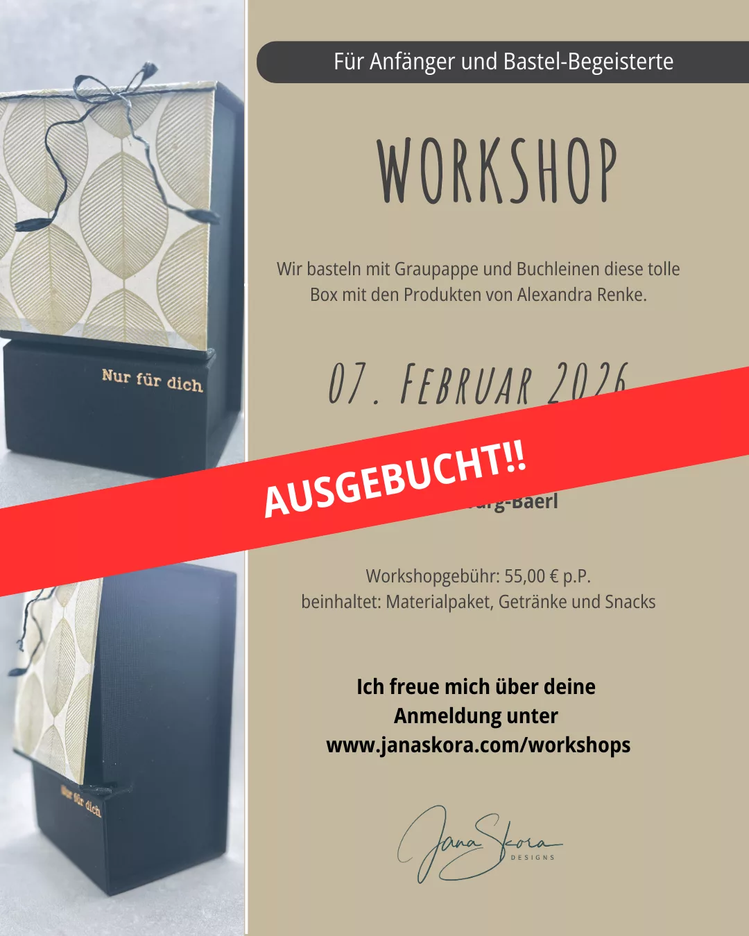 Am 7. Februar 2026 von 11:00 Uhr - 15:00 Uhr möchte ich mit dir wieder basteln. Diesmal wird es eine schöne Schachtel, die wir mit Graupappe und Buchleinen von Alexandra Renke basteln.